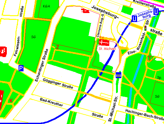 | Vom Johann-Michael-Fischer-Platz vor St. Michael führt die Clemens-August-Straße zur Josephsburgstraße, wo nach kurzer Zeit rechts der U-Bahnhof Josephsburg und der "Grünzug ehemalige T5-Ost-Trasse" auftaucht, der hier allerdings nur aus einem schmalen grünen Streifen neben der Else-Rosenfeld-Straße besteht. | |||
