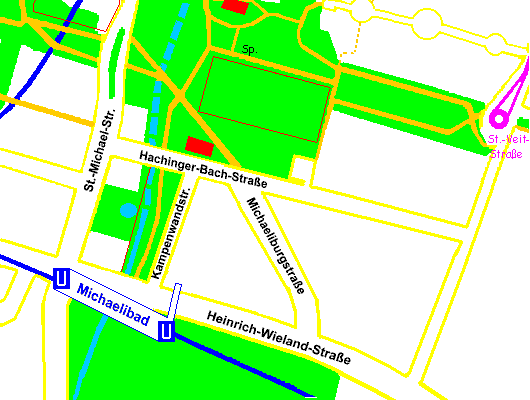 | verläuft der Weg vorbei an der Versickerungsstelle des Hachinger Baches zur Heinrich-Wieland-Straße, die er beim Michaelibad erreicht. Der Weg ist (Stand: Sommer 2001) noch unbefestigt; man kann auch die Kampenwandstraße daneben benutzen. | |