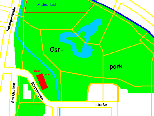| Wer hier nach Süden will, steht vor der Entscheidung, dem Hachinger Bach zu folgen und links nach Osten einzubiegen oder geradeaus über den Steg zu gehen und dem Grünzug zu folgen. Zwischen den beiden Wegen steht das Gebäde der Eislaufbahn. Beide Wege treffen auf die Staudingerstraße. | |