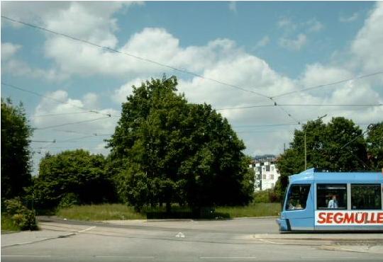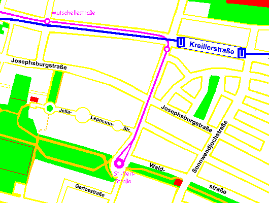 Am östlichen Ende des Michaelianger-Parks überquert der Grünzug die St.-Veit-Straße. Hier wendet die Straßenbahnlinie 19.